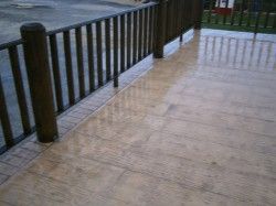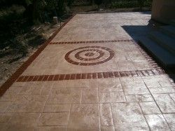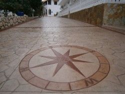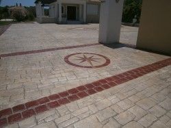 Το σταμπωτό δάπεδο είναι ένα σύστημα που χρησιμοποιεί ως βασικό υλικό το σκυρόδεμα C16/20 με πάχος 8-12cm, ενδυναμωμένο με ίνες πολυπροπυλενίου και με δομικό πλέγμα 15x15. Στη συνέχεια κάνουμε επίπαση, ρίχνοντας σκληρυντικές χρωματιστές σκόνες. Όταν το μπετόν φτάσει στο πλαστικό στάδιο, καλύπτεται με ειδική αντικολλητική σκόνη και εφαρμόζουμε τη διαδικασία σταμπαρίσματος. Μετά την ωρίμανση 48 ωρών του δαπέδου, χαράζονται αρμοί διαστολής περίπου ανά 20τ.μ. και πλένεται με πιεστική μηχανή με νερό, χωρίς υδροχλωρικό οξύ. Τέλος, όταν στεγνώσει, σφραγίζεται με ειδικό βερνίκι. Το σταμπωτό δάπεδο εφαρμόζεται σε δάπεδα μεγάλων απαιτήσεων, όπως σε δρόμους, πλατείες, πεζοδρόμια, χώρους στάθμευσης, αυλές, πυλωτές, εκθεσιακούς χώρους και γύρω από πισίνες. Σταμπωτό δάπεδο μπορούμε να εφαρμόσουμε χωρίς μπετόν σε πάχος 1-3cm με υλικά δύο συστατικών σε διάφορα χρώματα, που είναι αποδεκτό σε κάθε βάρος. Κόστος τοποθέτησης περίπου 22 ευρώ/τ.μ.